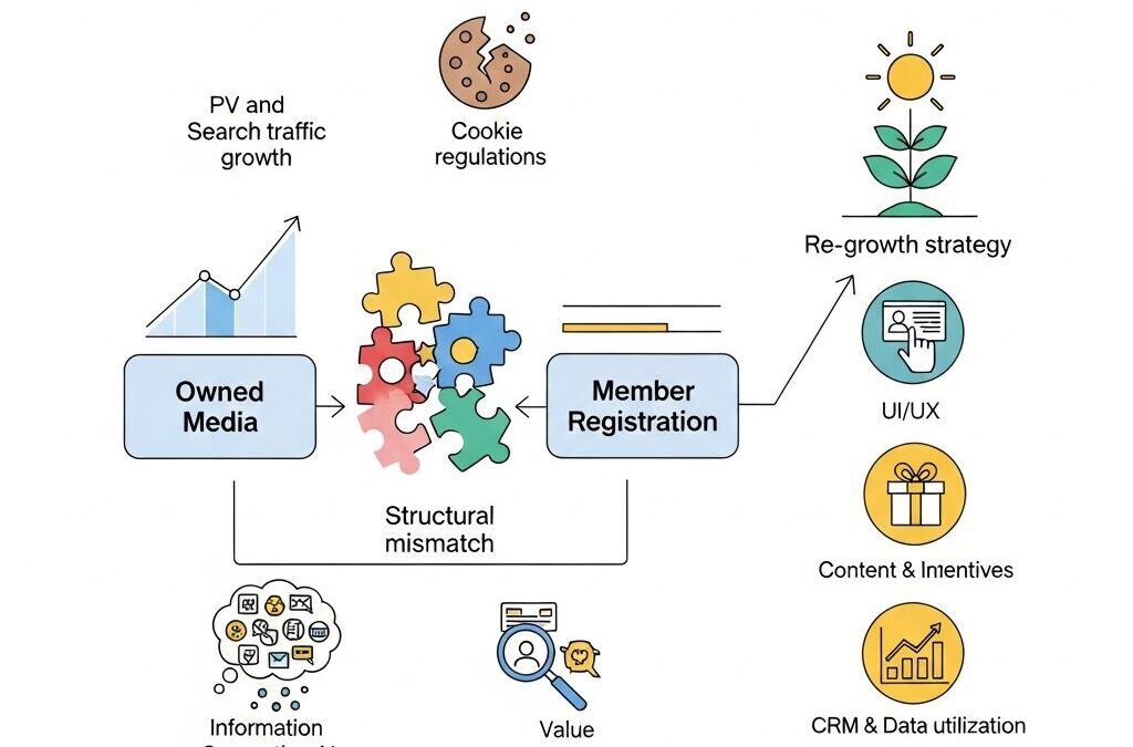 オウンドメディアの会員獲得が停滞する最大の理由は、流入数の問題ではなく、**「読まれているのに登録されない構造」**が放置されている点にあります。Cookie規制の進行や生成AIによるコンテンツ増加により、ユーザーは情報の取捨選択に慣れ、単に役立つ記事を読んだだけでは個人情報を差し出さなくなっています。